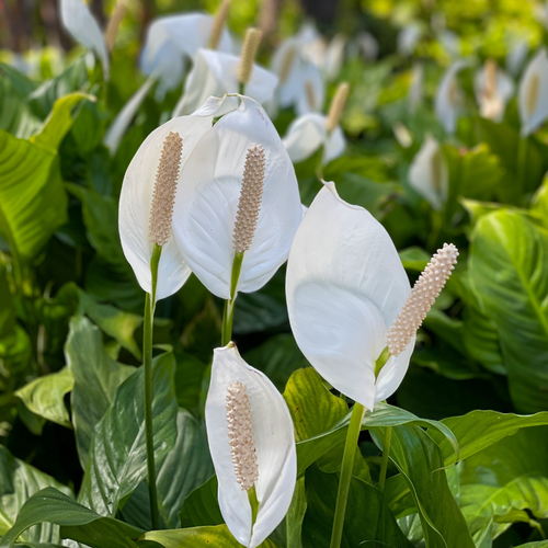 - Spathiphyllum (Lepelplant): elegant en bekend om haar witte bloemen